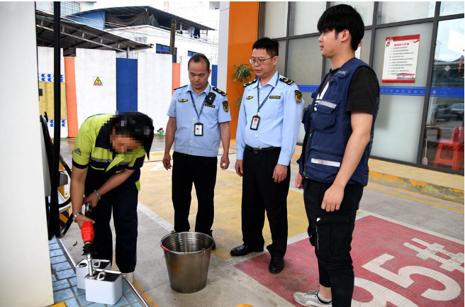 来宾市市场监管局执法人员对加油站销售的成品油进行抽样。